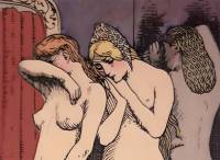 Das Bild zeigt drei Frauen, die stark beschämt zur Beichte gehen. Es wurde im Original ursprünglich in einem Buch veröffentlicht.